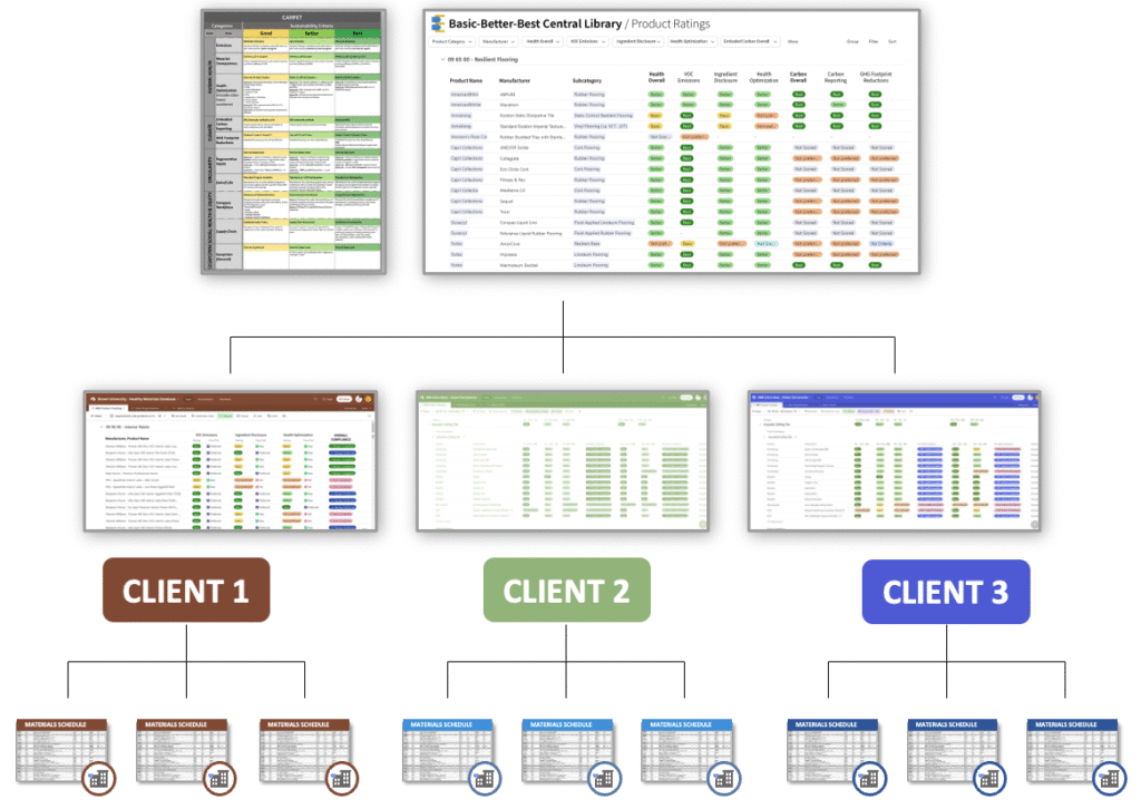 BBB builds on mindfulMATERIALS’ CMF by using industry criteria, balanced with market realities of what is available and then lets every owner or design firm add their own prioritization, or weighting to the CMF criteria that align with their internal goals. That means the same product might come out as “better” based on one owner’s priorities but “best” based on another owner’s priorities. This is already how standards happen, but with each organization reinventing the wheel, spending enormous amounts of time and effort to achieve the same result.