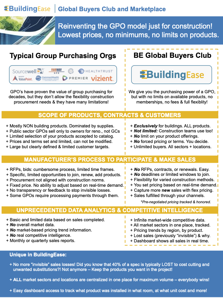 A: A Buyer is most typically an owner (facility manager purchasing items for replacement or small renovation), or a construction professional. There are cases where another party, such as a designer with special services that include procurement, also uses the platform. Although residential projects are included in our platform and there’s no reason that homeowners couldn’t purchase products, it is recommended to have their builder make purchases. A Seller could be a manufacturer, rep, distributor or similar. Sometimes manufacturers sell products directly but otherwise, a manufacturer is likely to be the first contact for the Buyer’s Club because many distributors are regional so can’t group purchases from all around the US to offer volume discounts.